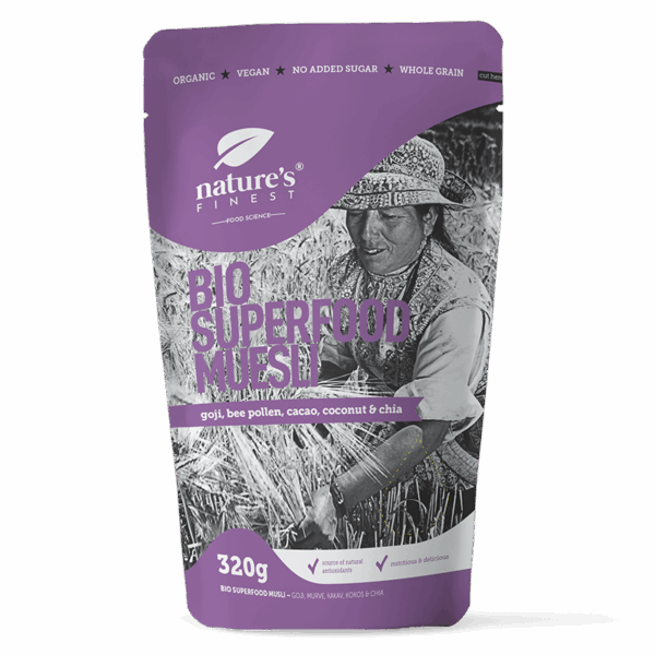 Bio Superfood Muesli is een mengsel van hele granen, zaden en supervruchten. Het heeft een zoete en rijke smaak.