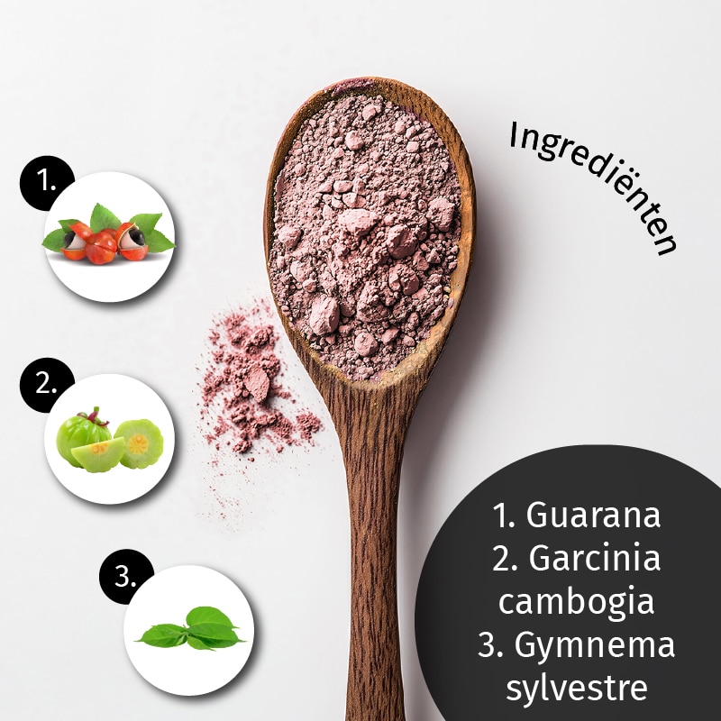 Ingrediënten: Inulinepoeder, zoetstof: erytritol, ID-alG™ ((extract van zeewier (Ascophyllum nodosum) (50%), druivenextract in poedervorm (Vitis vinifera, zaad) (50%)), frambozenaroma, guarana-extract (Paullinia cupana Kunth), Garcinia cambogia-extract (Garcinia gummi-gutta), gurmar-extract (Gymnema sylvestre), rodebietenconcentraat (maltodextrine, rode bietenpoeder (Beta vulgaris)). Bevat van nature aanwezige sulfieten.