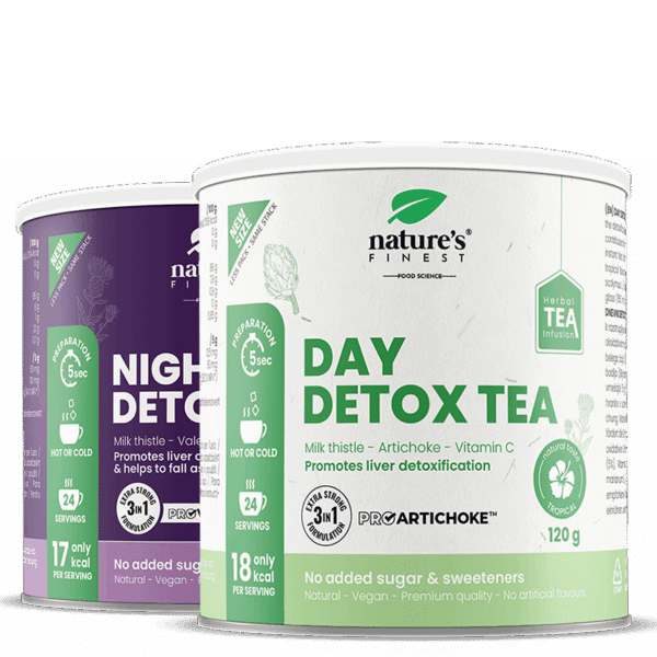 • Dagelijkse detox-thee: met ProArtichoke™-extract, mariadistel, witte thee en vitamine C – bevordert de ontgifting van het lichaam, helpt bij overmatig gewichtsverlies, reinigt de lever en verbetert de spijsvertering.