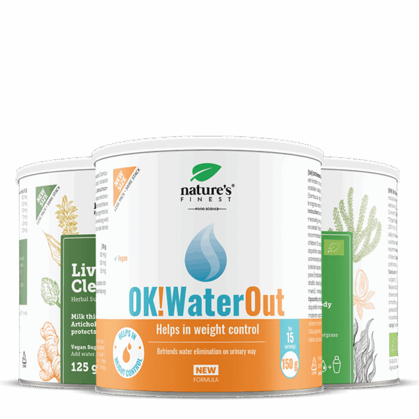 OK!WaterOut: brandnetel, vlierbes, paardenstaart. Liver Cleanse: mariadistel, kurkuma, artisjok. Bio Detox: tarwegras, spirulina, chlorella, gerst, lucuma.