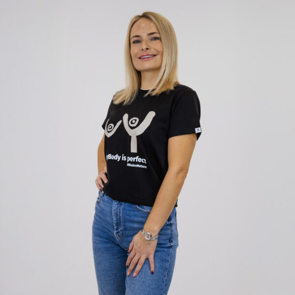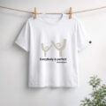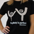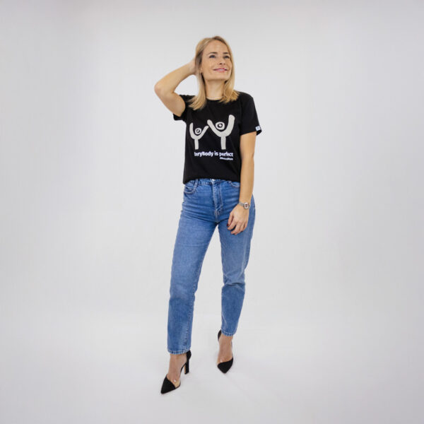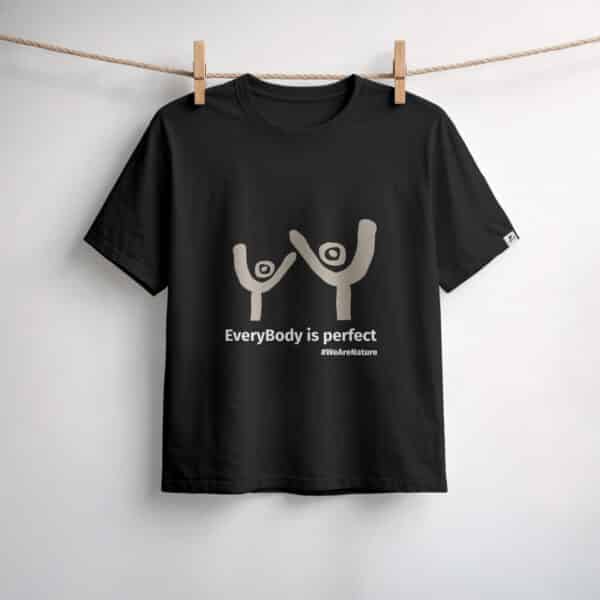 Een minimalistisch zwart T-shirt, ontworpen voor moeiteloos zelfvertrouwen elke dag. Met een eenvoudige, abstracte graphic van twee blije figuren en de boodschap “EveryBody is perfect” in een zachte neutrale print, viert het authenticiteit, inclusiviteit en zelfliefde.