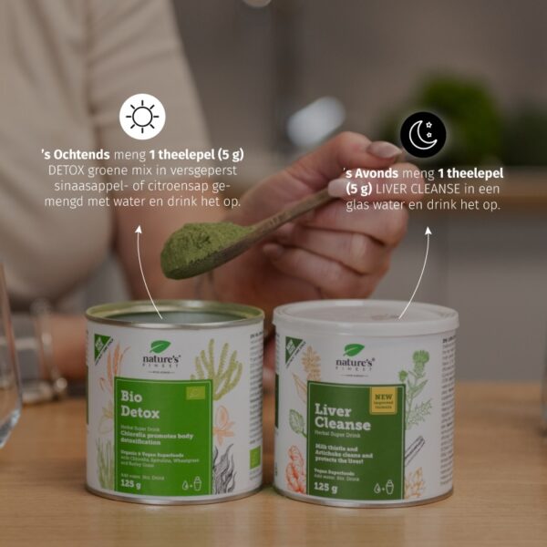 ’s Avonds meng 1 theelepel (5 g) LIVER CLEANSE in een glas water en drink het op. Dit zal de leverzuivering ’s nachts bevorderen en je rustperiode optimaal benutten.