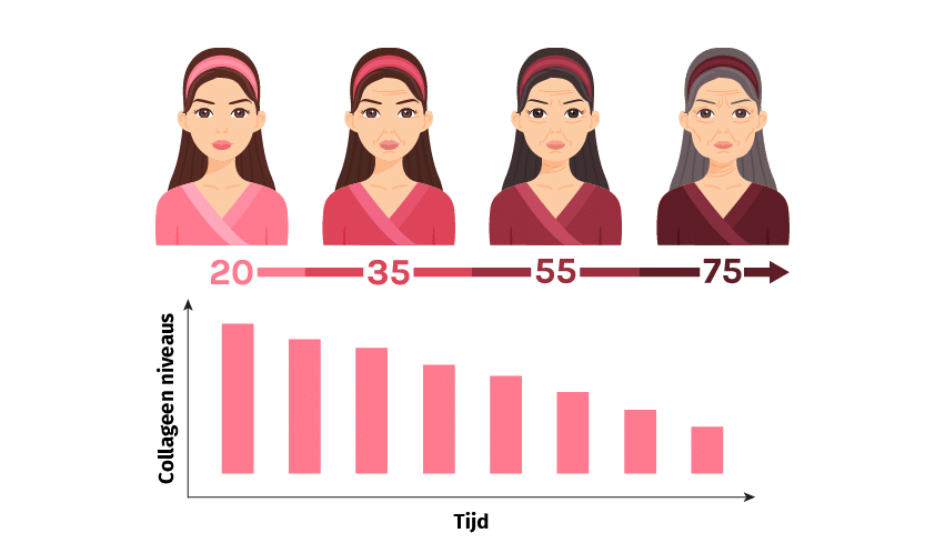 Vanaf halverwege de twintig neemt de natuurlijke collageenproductie in het lichaam geleidelijk af als onderdeel van het normale verouderingsproces. Dit leidt tot fijne lijntjes, rimpels en brozere nagels. Het collageenniveau daalt elk jaar met ongeveer 1 %, met een snellere daling voor en na de menopauze.