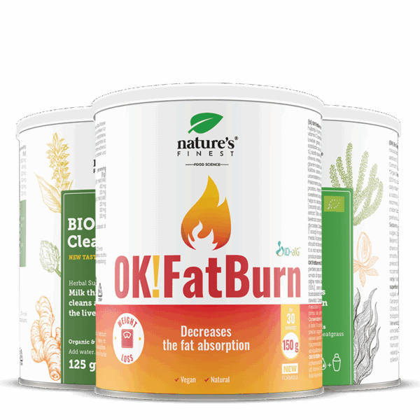 OK!FatBurn: vitamine C, ID-alG™, L-karnitine, L-tyrosine, LIVER CLEANSE mariadistel poeder, schisandra poeder, kurkuma poeder, artisjokextract Bio DETOX tarwegras, spirulina, chlorella, gerstegras, lucuma.
