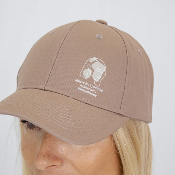Een minimalistische bruine pet ontworpen voor een moeiteloze dagelijkse stijl. Met een verfijnde line-artafbeelding en de boodschap “Nature isn’t polished, neither am I” in een strakke witte opdruk, benadrukt ze authenticiteit en natuurlijk zelfvertrouwen.