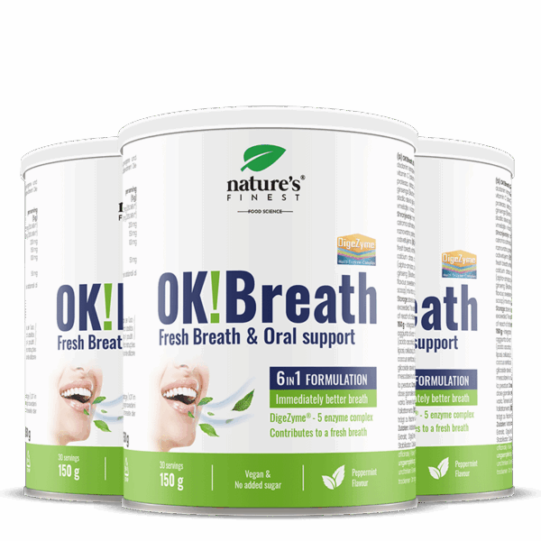 OK!Breath combineert een mengsel van 6 effectieve ingrediënten met een gepatenteerd DigeZyme® complex dat vijf spijsverteringsenzymen bevat die slechte adem bij de bron helpen oplossen.