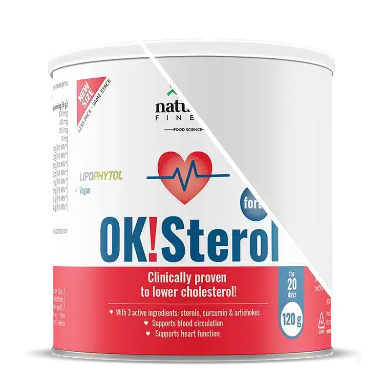 OK!Sterol Forte bevat het gepatenteerde Lipophytol® met fytosterolen, die bijdragen aan het behoud van normale cholesterolgehalten in het bloed¹. Artisjok helpt ook om het bloedlipidengehalte te verlagen³, terwijl kurkuma de hartgezondheid ondersteunt².