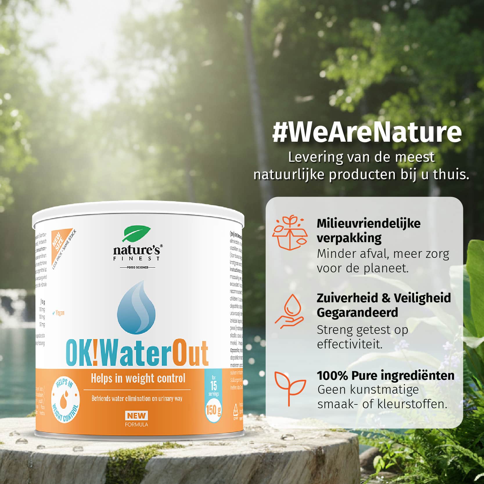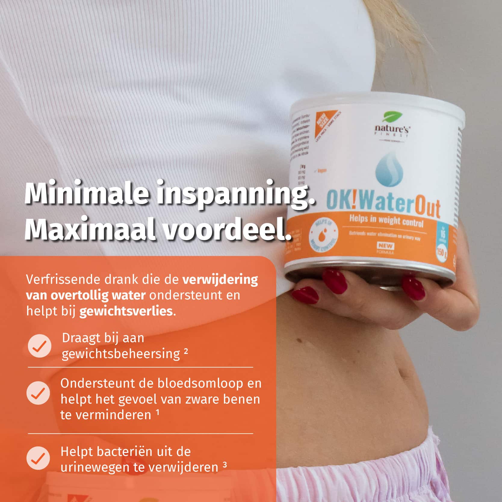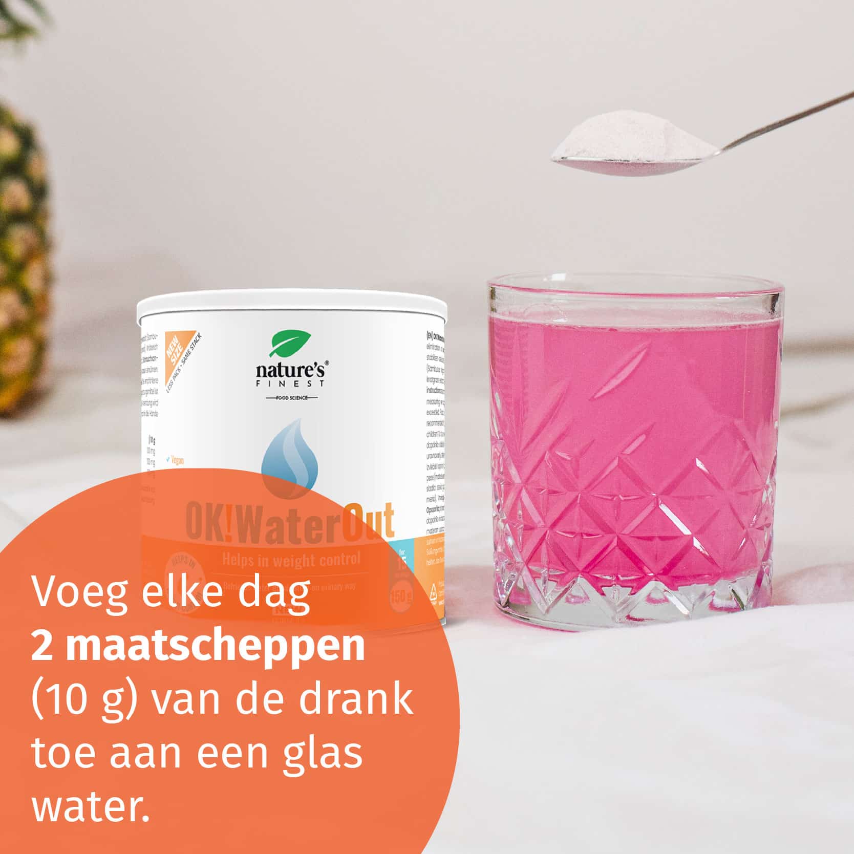 Elke dag doseert u 2 maatschepjes (10 g) OK!WaterOut drank in een glas water. Met één maatschepje krijgt u 100 mg brandnetelextract, 100 mg vlierbessenextract en 50 mg duizendknoopextract binnen.