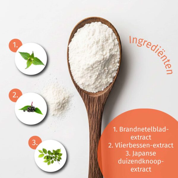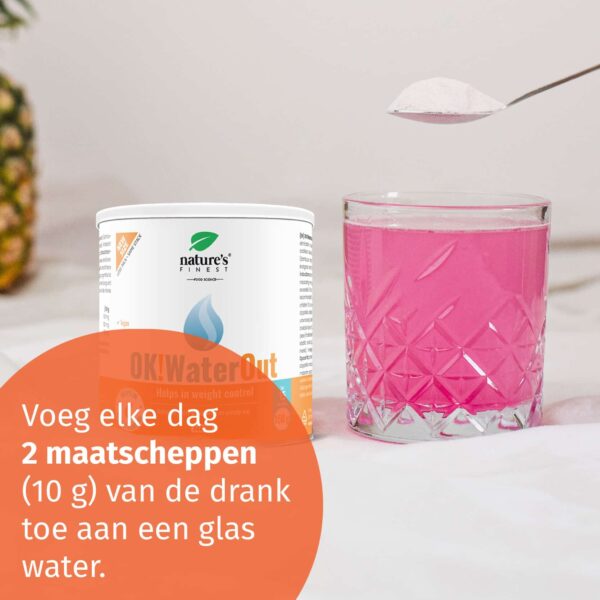 Elke dag doseert u 2 maatschepjes (10 g) OK!WaterOut drank in een glas water. Met één maatschepje krijgt u 100 mg brandnetelextract, 100 mg vlierbessenextract en 50 mg duizendknoopextract binnen.