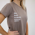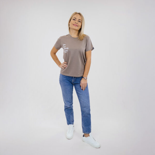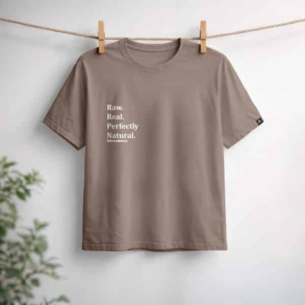 Een minimalistisch bruin T-shirt ontworpen voor een moeiteloze alledaagse stijl. Met de uitspraak “Raw. Real. Perfectly. Natural.” in een strakke witte print combineert het comfort met een authentieke, zelfverzekerde uitstraling.