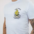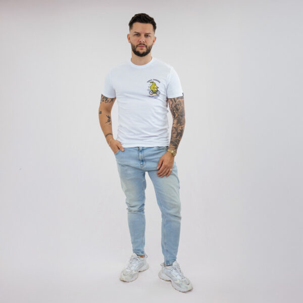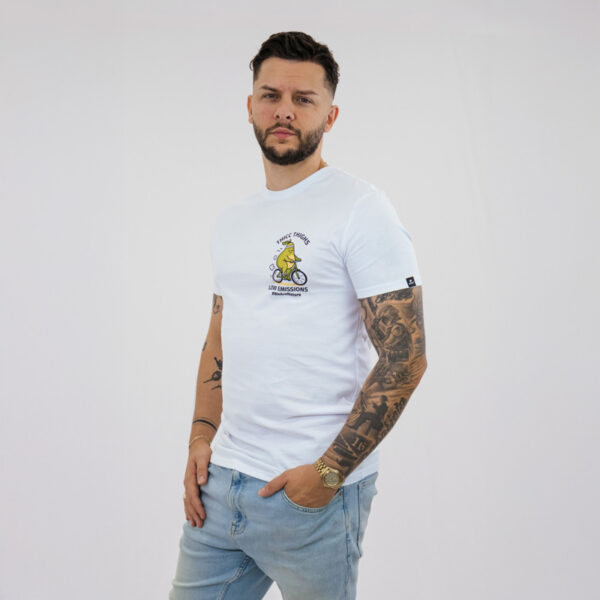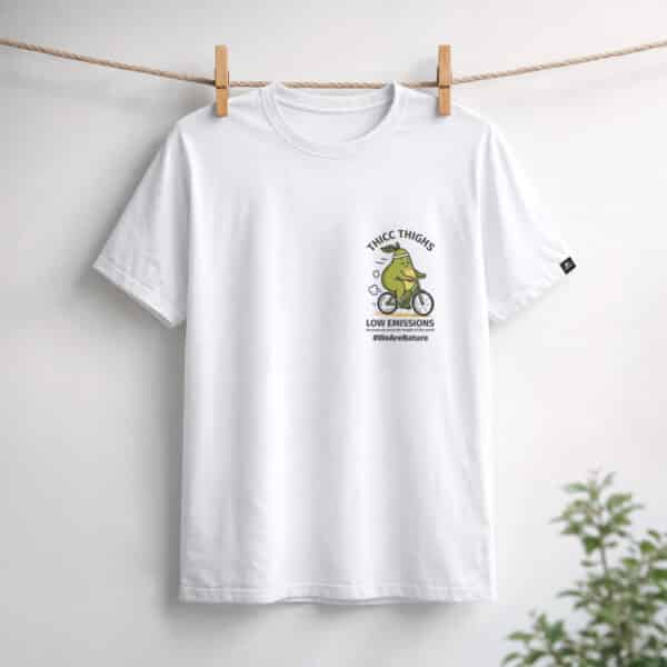 Een wit T-shirt ontworpen voor een moeiteloze dagelijkse stijl. Met de statement “Thicc thighs, low emissions” en een speelse avocado-op-een-fiets illustratie viert het zelfvertrouwen, zelfliefde en bewust leven.