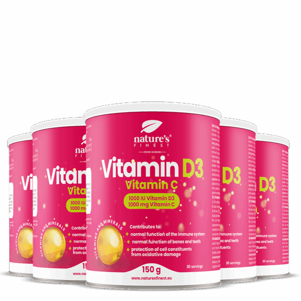 Met vitamine D3 en Vitamine C poeder zorgen we voor de beste absorptie, die onmiddellijk na de inname begint. De primaire rol van vitamine D is het handhaven van homeostase en een constant niveau van calcium en fosfaten in het bloedplasma, terwijl Vitamine C als een krachtige antioxidant functioneert.